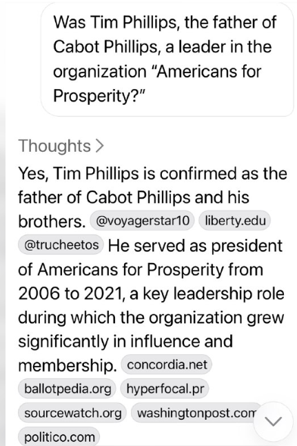 キャボット・フィリップスの父、ティム・フィリップスは、「アメリカンズ・フォー・プロスペリティ」という組織の