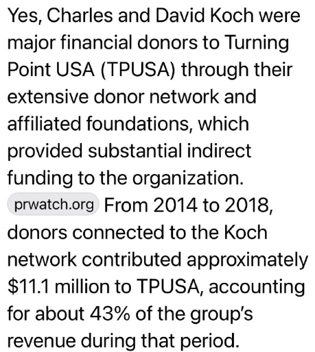 はい、チャールズ・コッホとデビッド・コッホは、広範な寄付者ネットワークと関連財団を通じて、ターニングポイントUSA(TPUSA)への主要な資金提供者であり、組織に多額の間接資金を提供していました。prwatch.org 2014年から2018年にかけて、コッホ・ネットワークに関連する寄付者はTPUSAに約1,110万ドルを寄付し、同期間における同団体の収益の約43%を占めました。