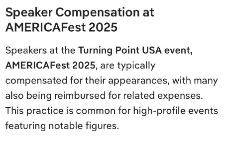 Turning Point USA主催イベント、AMERICAFest 2025の講演者には、通常、出演料が支払われ、多くの講演者が関連経費も払い戻しを受けます。