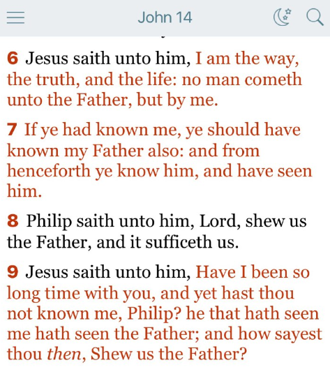 6 イエスは彼に言われた。「わたしは道であり、真理であり、命である。わたしを通してでなければ、だれも父のみもとに行くことはできない。