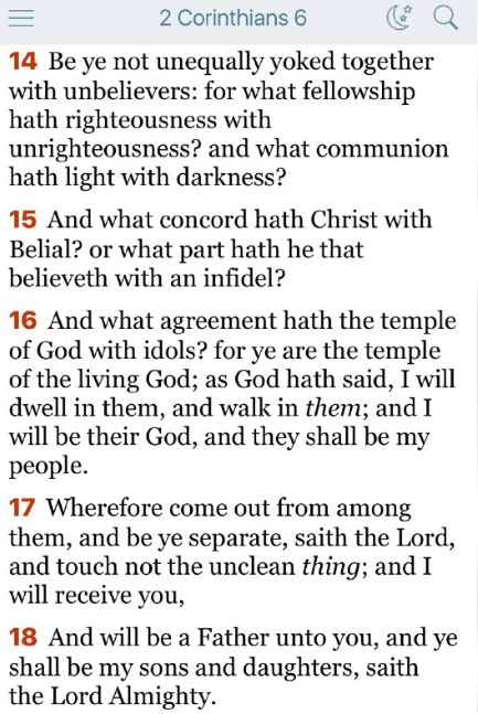 14 不信者と、つり合わぬくびきをいっしょにつけてはいけません。正義と不法とに、どんなつながりがあるでしょう。光と暗やみとに、どんな交わりがあるでしょう。