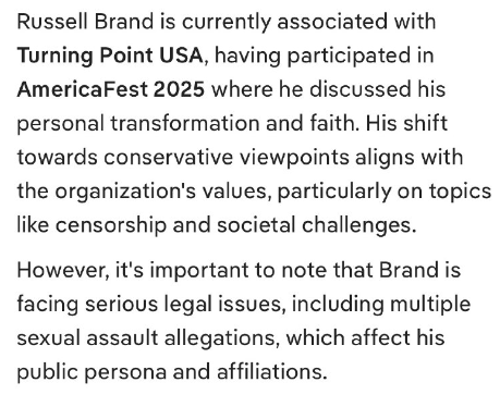 ラッセル・ブランドは現在、Turning Point USAに所属しており、2025年のアメリカフェストに参加し、自身の変容と信仰について語りました。彼の保守的な視点への転換は、特に検閲や社会課題といったテーマにおいて、同団体の価値観と一致しています。しかしながら、ブランドは複数の性的暴行疑惑を含む深刻な法的問題に直面しており、それが彼の公的な人格と関係性に影響を与えていることに留意することが重要です。