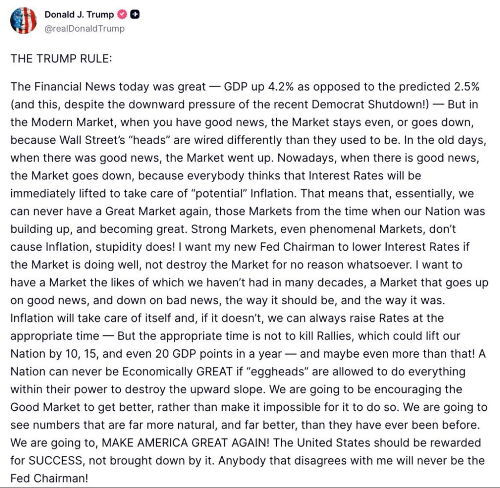新しいFRB議長には、市場が好調であれば金利を引き下げてほしい。理由もなく市場を破壊するようなことはしない。何十年も経験したことのないような市場、良いニュースで上昇し、悪いニュースで下落する市場、本来あるべき姿、そしてかつてそうであったように。インフレは自然に収束する。もし収束しない場合は、いつでも適切なタイミングで金利を引き上げる。しかし、適切な時期とは、景気回復を阻害する時期ではない。景気回復は、1年でGDPを10ポイント、15ポイント、あるいは20ポイントも押し上げる可能性がある。もしかしたらそれ以上かもしれない。