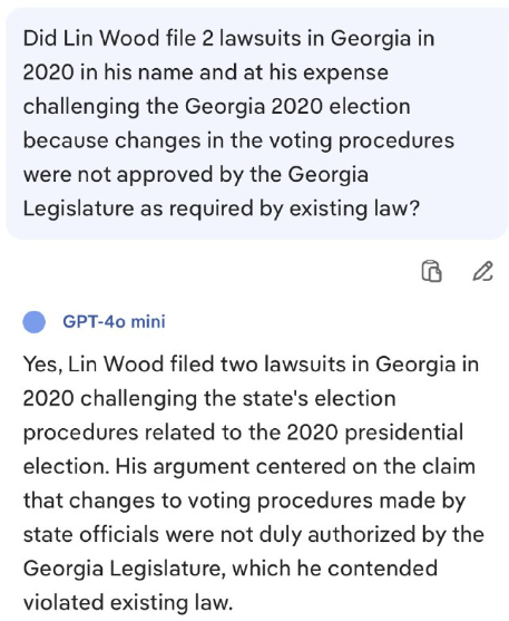 リン・ウッド氏は、2020年にジョージア州で、自身の名義と費用で、2020年大統領選挙に関連する州の選挙手続きに異議を唱える訴訟を2件提起しました。これは、投票手続きの変更が、既存の法律で義務付けられているジョージア州議会によって承認されなかったためです。
