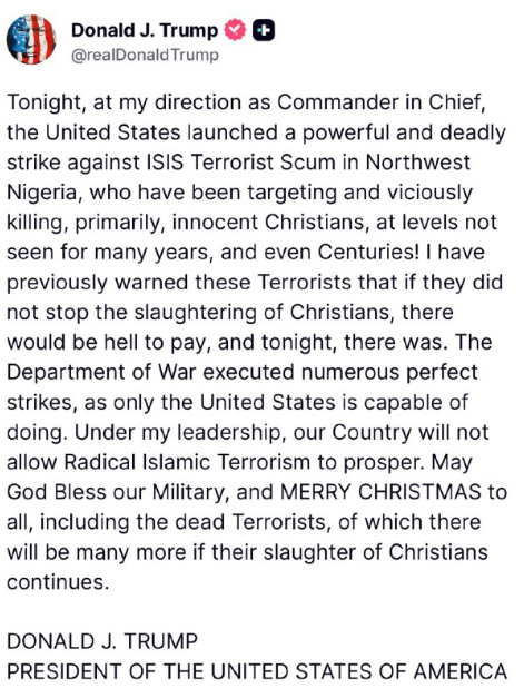 米国はナイジェリア北西部のISISテロリストに対し、強力かつ致命的な攻撃を開始しました。彼らは、主に罪のないキリスト教徒を標的とし、長年、いや数世紀にもわたって見られなかったほどの残忍な殺害を行ってきました。
