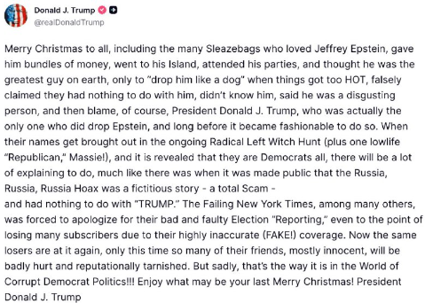 ジェフリー・エプスタインを愛し、彼に大金を渡し、彼の島へ行き、パーティーに出席し、彼を地球上で最も素晴らしい人物だと思っていた多くの卑劣漢たちを含め、皆様にメリークリスマス。