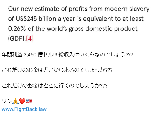 私たちが新たに推定した現代の奴隷制による利益は年間2450億米ドルであり、これは世界の国内総生産(GDP)の少なくとも0.26%に相当します