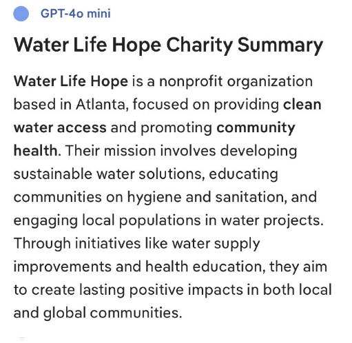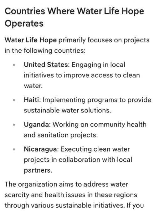 ウォーター・ライフ・ホープは、アトランタに拠点を置く非営利団体で、清潔な水へのアクセスの提供と地域社会の健康促進に重点を置いています。持続可能な水ソリューションの開発、地域社会への衛生教育、そして地域住民の水関連プロジェクトへの参加促進を使命としています。水供給の改善や健康教育といった取り組みを通じて、地域社会と世界の両方に永続的なプラスの影響を与えることを目指しています。