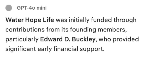 ウォーター・ホープ・ライフは当初、創設メンバー、特にエドワード・D・バックリー氏からの寄付によって運営されていました。バックリー氏は初期から多大な資金援助を