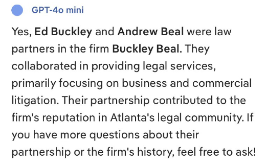 はい、エド・バックリーとアンドリュー・ビールは、バックリー・ビール法律事務所のパートナーでした。二人は協力して法律サービスを提供し、主にビジネスおよび商業訴訟に注力していました。二人のパートナーシップは、アトランタの法律界における当事務所の評判向上に貢献しました。パートナーシップや当事務所の歴史についてご質問がございましたら、お気軽にお問い合わせください。