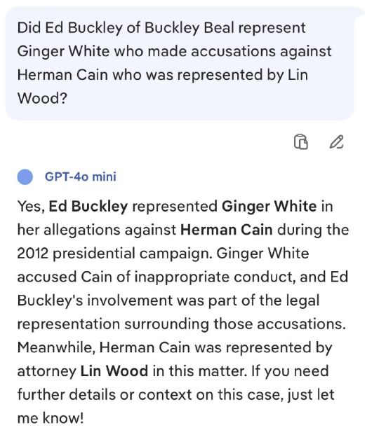 一方、Herman Cainの代理人は、この件でLin Wood弁護士でした。この件についてさらに詳しい情報や背景情報が必要な場合は、お気軽にご連絡ください。