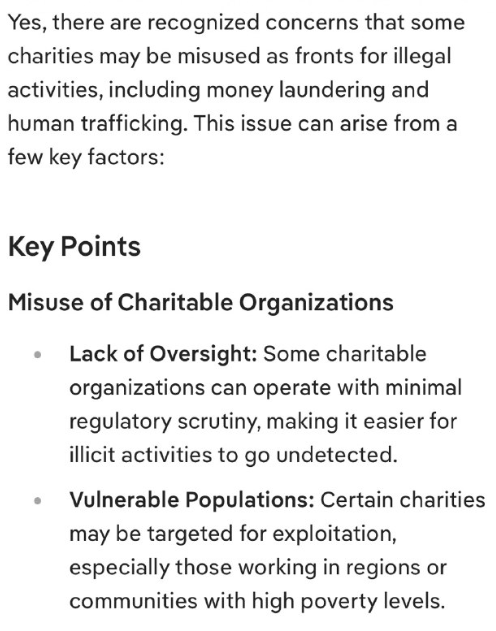 はい、一部の慈善団体がマネーロンダリングや人身売買などの違法行為の隠れ蓑として悪用される可能性があるという懸念が認識されています。この問題は、いくつかの主要な要因から生じます。