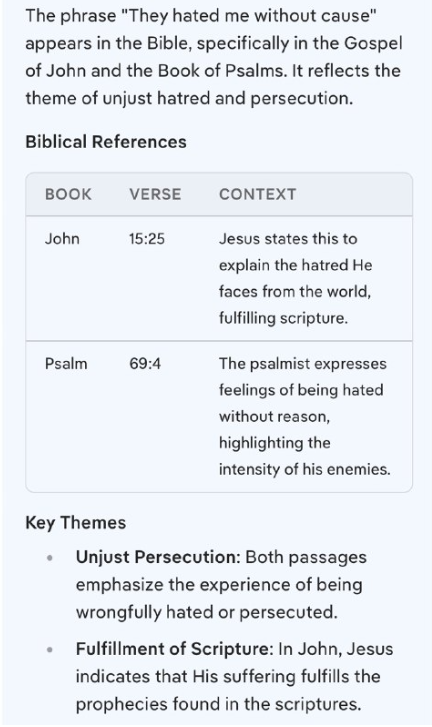 彼らは理由もなく私を憎んだ」という表現は、聖書、特にヨハネによる福音書と詩篇に出てきます。これは、不当な憎しみと迫害というテーマを反映しています。