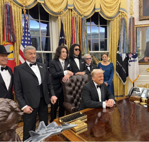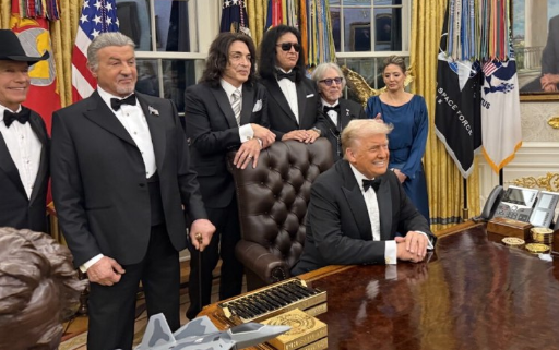 ※この画像は、ドナルド・トランプ大統領とロックバンド「KISS」のメンバーがホワイトハウスの執務室で面会した瞬間を捉えたものです。