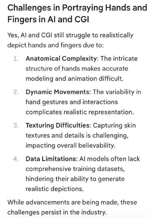 はい、AIとCGIは、以下の理由により、手と指をリアルに描写するのに依然として苦労しています。