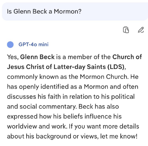 はい、グレン・ベックは末日聖徒イエス・キリスト教会(LDS)、通称モルモン教会の信者です。