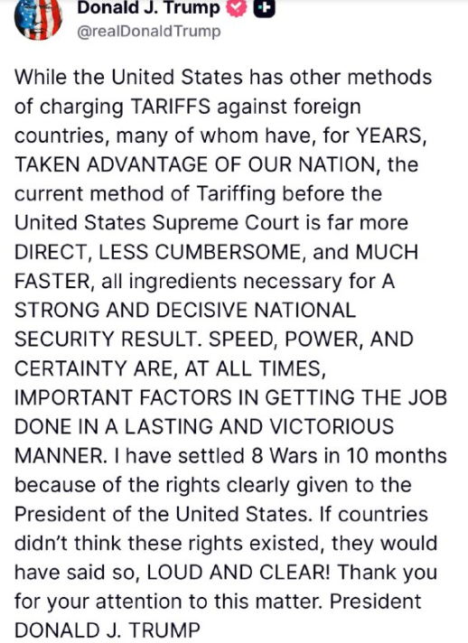 米国には、長年にわたり我が国を不当に利用してきた多くの国々に対して関税を課す他の方法がありますが、米国最高裁判所における現在の関税賦課方法は、はるかに直接的で、煩雑さが少なく、はるかに迅速であり、強力で決定的な国家安全保障を実現するために必要なすべての要素を備えています。スピード、パワー、そして確実性は、常に、永続的かつ勝利をもたらす方法で任務を遂行する上で重要な要素です。私は10ヶ月で8つの戦争を解決しました。それは、米国大統領に明確に与えられた権利のおかげです。もし各国がこれらの権利の存在を認識していなかったなら、彼らはそうはっきりと主張していたでしょう!この件にご関心をお寄せいただきありがとうございます。