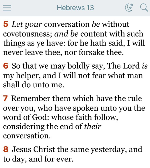 5 あなたがたの交わりには貪欲があってはなりません。そして、持っているもので満足しなさい。主は、「わたしは決してあなたを離れず、あなたを見捨てない」と言われたからです。