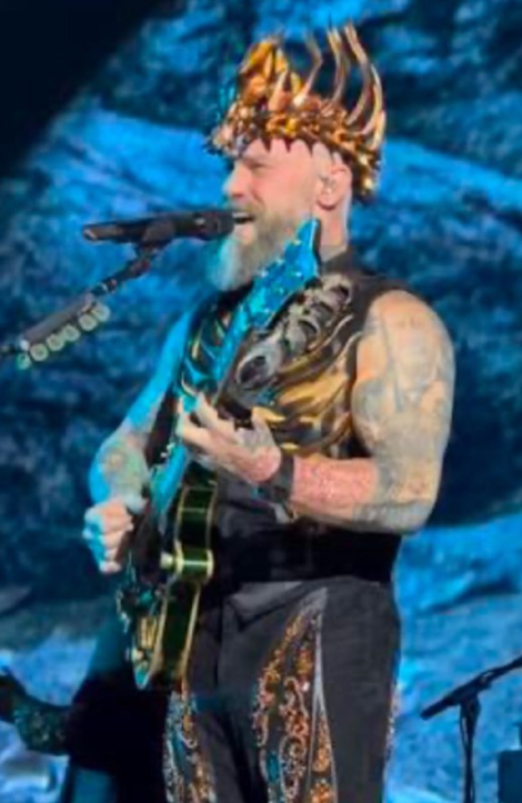 画像は、ザック・ブラウン・バンドのリードボーカル、ザック・ブラウンのライブパフォーマンスの瞬間です。