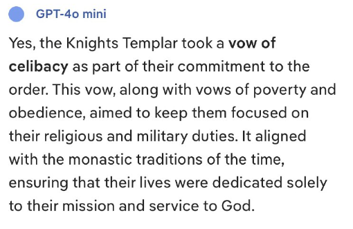 はい、テンプル騎士団は騎士団への忠誠の一環として独身の誓いを立てました。この誓いは、清貧と服従の誓いとともに、彼らが宗教的および軍事的義務に集中し続けることを目的としていました。これは当時の修道院の伝統と一致し、彼らの人生が神への使命と奉仕にのみ捧げられることを保証しました。