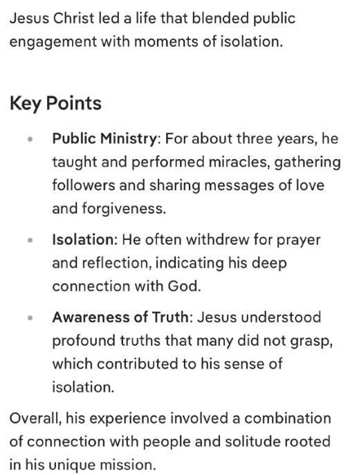 全体として、イエスの経験は、人々とのつながりと、彼独自の使命に根ざした孤独が組み合わさったものでした。