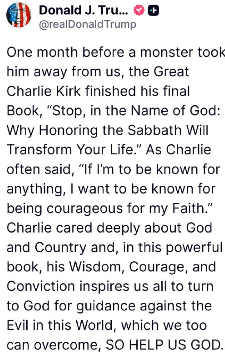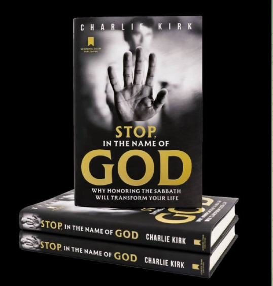 これはチャーリー・カーク著のハードカバー本『ストップ、イン・ザ・ネーム・オブ・ゴッド:なぜ安息日を守ることがあなたの人生を変えるのか』です。