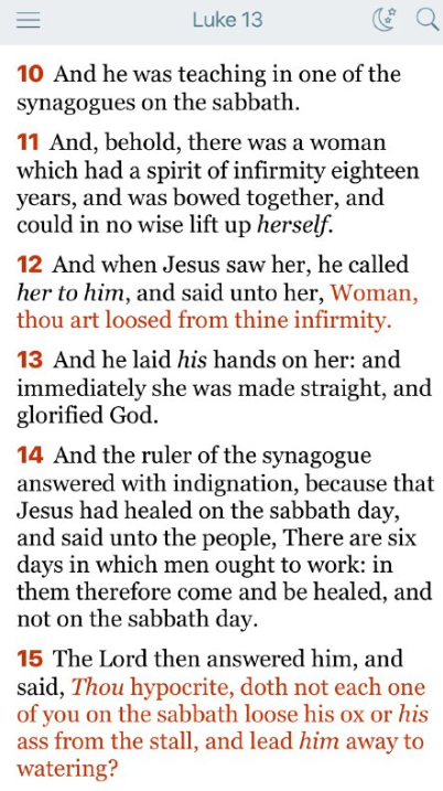 12 イエスは彼女を見て、呼び寄せ、「婦人よ、あなたの病気は治りました」と言われた。