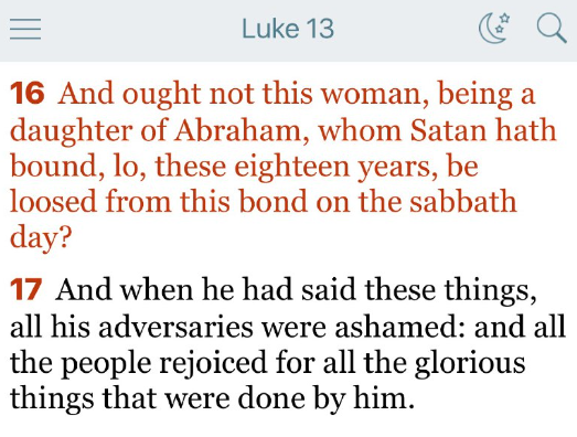16 この女はアブラハムの娘であり、サタンに十八年も縛られていたのに、安息日にその束縛から解かれるべきではなかったでしょうか。