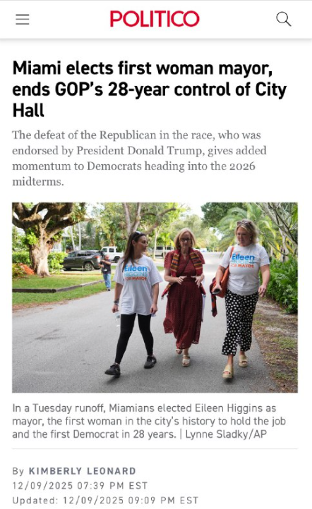 マイアミでまたしても不正選挙が行われたが、民主党のアイリーン・ヒギンズ氏が勝利したことを祝福する。