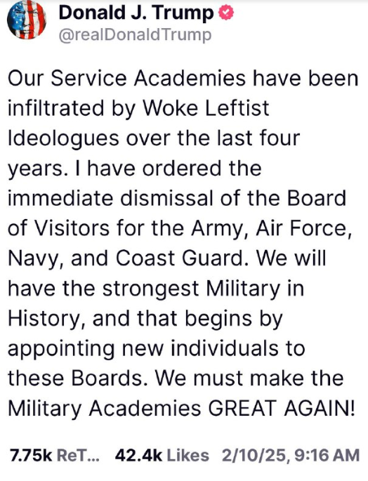 過去 4 年間、私たちの軍事アカデミーには、目覚めた左翼の思想家が浸透してきました。私は陸軍、空軍、海軍、沿岸警備隊の視察委員会の即時解任を命じました。私たちは歴史上最強の軍隊を持つことになりますが、それはこれらの委員会に新しい人物を任命することから始まります。私たちは軍事アカデミーを再び偉大なものにしなければなりません!