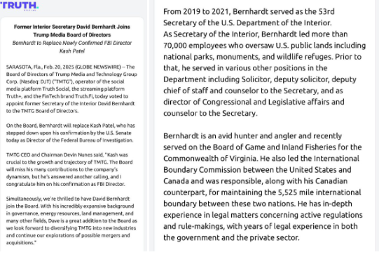 フロリダ州サラソタ、2025年2月20日(GLOBE NEWSWIRE)–ソーシャルメディア・プラットフォーム「Truth Social」、ストリーミング・プラットフォーム「Truth+」、フィンテック・ブランド「Truth.Fi」を運営するトランプ・メディア・アンド・テクノロジー・グループ(Nasdaq: DJT)(以下「TMTG」)の取締役会は本日、元内務長官のデイビッド・バーンハート氏をTMTGの取締役会に任命することを決議した。