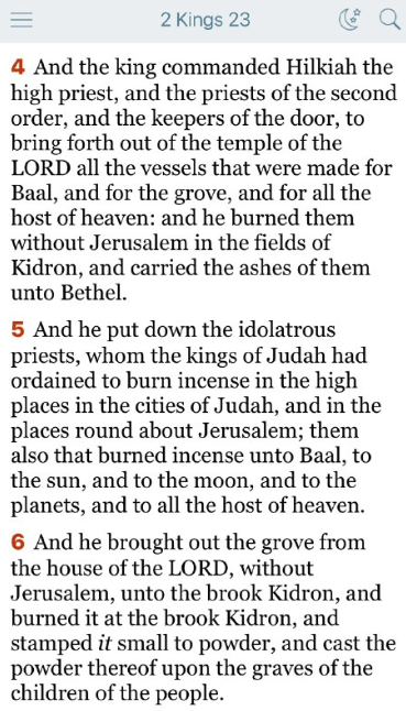 4 王は大祭司ヒルキヤと次席の祭司たち、および門を守る者たちに命じて、主の宮から、バアルとアシラ像と天の万象のために造られたすべての器を運び出させ、エルサレム郊外のキデロンの野でそれらを焼き、その灰をベテルに運び去った。