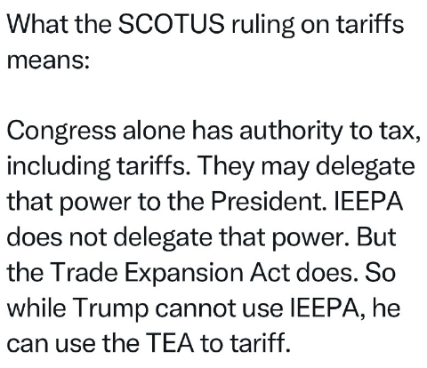 つまり、トランプ大統領はIEEPA(国際緊急経済権限法)を利用することはできませんが、TEAを利用して関税を課すことは可能です。