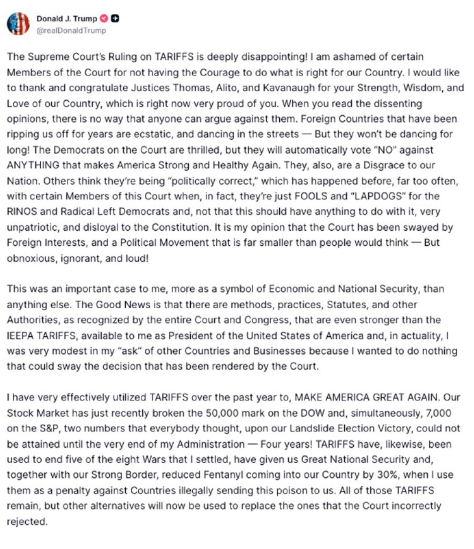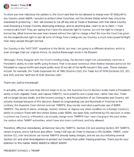 実際には、意図的ではなかったことは確かですが、最高裁の本日の判決は、大統領の貿易規制と関税発動の権限を縮小するどころか、より強力かつ明確にしました。この判決により、もはや疑いの余地はなく、流入する収入、そして我が国の企業と国家の保護は、実際に増加するでしょう。長年の法律と、それとは反対に数百もの勝利に基づくと、最高裁判所は関税を覆したのではなく、単にIEEPA関税の特定の適用を覆したに過ぎません。IEEPAに基づき、外国が米国との貿易を行う能力に対して、阻止、禁輸、制限、認可、またはその他の条件を課す権限が、この判決によって完全に確認されました。我が国を守るために、大統領は、私が過去に課していた他の様々な関税権限よりも高い関税を課すことが可能です。これらの権限も確認され、完全に認められています。したがって、直ちに発効し、すべての国家安全保障関税、第232条、および既存の第301条関税は、引き続き有効であり、完全に効力を持ちます。本日、私は、既に課されている通常の関税に加えて、第122条に基づき、10%のグローバル関税を課す命令に署名します。また、不公正な貿易慣行から国を守るため、第301条およびその他の調査も開始します。この件にご関心をお寄せいただき、ありがとうございます。