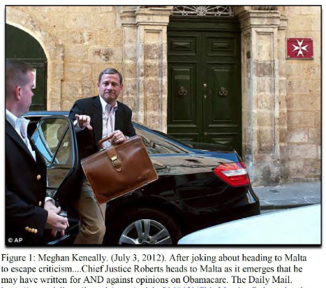 図1:メーガン・ケネアリー(2012年7月3日)。批判を逃れるためにマルタへ行くと冗談を言った後、ロバーツ最高裁判所長官は、オバマケアについて賛成意見と反対意見の両方を書いた可能性があることが明らかになり、マルタへ向かった。デイリー・メール紙。