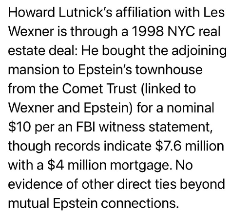 ハワード・ラトニックとレス・ウェクスナーの関係は、1998年のニューヨーク市での不動産取引によるものです。彼は、エプスタインのタウンハウスに隣接する邸宅を、ウェクスナーとエプスタインに関係のあるコメット・トラストから、FBIの証言によると名目価格10ドルで購入しました。記録によると、400万ドルの住宅ローンを含め、総額760万ドルでした。エプスタインとの相互関係以外に、直接的なつながりを示す証拠はありません。