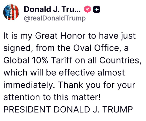 大統領執務室から、全ての国に対する10%の関税を