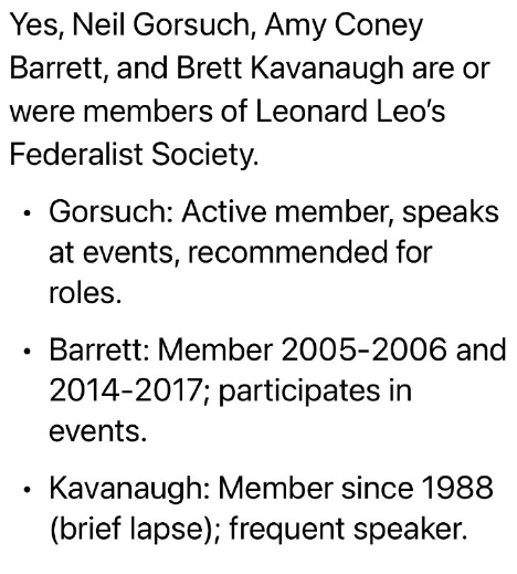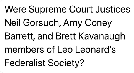 はい、ニール・ゴーサッチ、エイミー・コニー、バレット、ブレット・カバノーは、レナード・レオのフェデラリスト協会の会員です(または、かつて会員でした)。