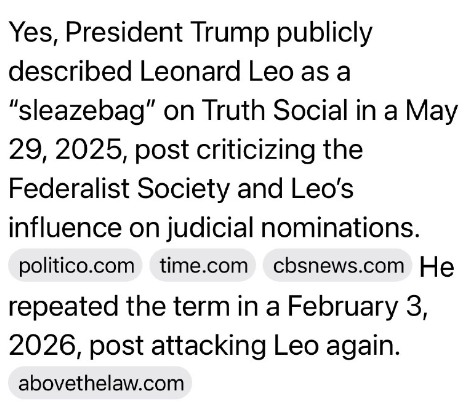 はい、トランプ大統領は2025年5月29日、Truth Socialでレオナルド・レオを「卑劣漢」と公然と呼び、連邦主義協会とレオの司法指名への影響力について批判しました。