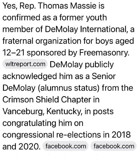 はい、トーマス・マシー下院議員は、フリーメイソンが後援する12歳から21歳の少年のための友愛団体であるデモレー・インターナショナルの元青年会員であることが確認されています。
