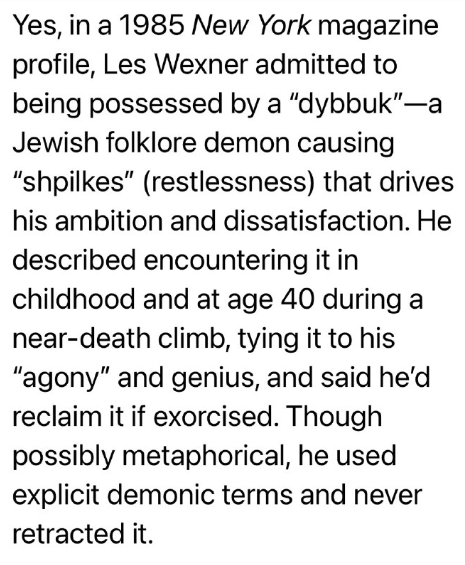はい、1985年のニューヨーク・マガジン誌のプロフィール記事で、レス・ウェクスナーは「ディブック」に取り憑かれていることを認めています。これはユダヤの民間伝承に登場する悪魔で、彼の野心と不満の源である「シュピルケ」(落ち着きのなさ)を引き起こします。彼は幼少期と40歳の時に瀕死の登山中にこの悪魔に遭遇したことを描写し、それを自身の「苦悩」と天才性に結び付け、もし悪魔祓いができれば取り戻すだろうと述べています。比喩的な表現だった可能性はありますが、彼はあからさまに悪魔的な言葉を使い、それを撤回することはありませんでした。