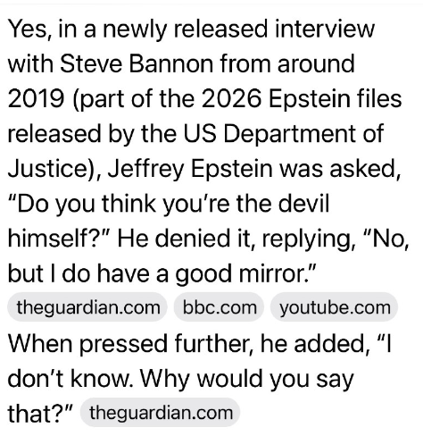 はい、2019年頃にスティーブ・バノン氏に行われた新たに公開されたインタビュー(米国司法省が公開した2026年のエプスタイン文書の一部)で、ジェフリー・エプスタイン氏は「あなたは自分が悪魔だと思っていますか?」と問われ、それを否定し、「いいえ、でも私にはいい鏡があります」と答えました。
