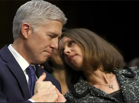 この画像には、ニール・ゴーサッチ連邦最高裁判所判事と、その妻であるマリー・ルイーズ・ゴーサッチが写っています。この場面は、2017年3月20日、ワシントンD.C.の連邦議会議事堂(キャピトル・ヒル)で開催された、ゴーサッチ氏の最高裁判事指名承認公聴会の初日に撮影されたものです。