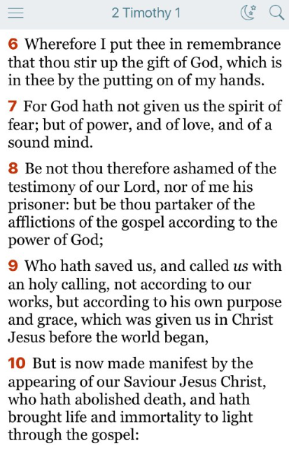 私の手を置くことによってあなたのうちに与えられている神の賜物を、燃え立たせなさい。