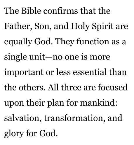 聖書は、父、子、聖霊が等しく神であることを確認しています。三者は一つのユニットとして機能し、誰かが他の者よりも重要であったり、重要でなかったりすることはありません。三者とも、人類のための計画、すなわち救い、変革、そして神の栄光に焦点を合わせています。