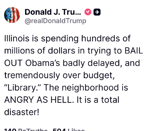 イリノイ州は、オバマ大統領の「図書館」建設が大幅に遅れ、予算を大幅に超過した救済策として、数億ドルを費やしています。住民は激怒しています。これは全くの惨事です!