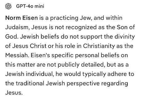 ノーム・アイゼンはユダヤ教徒ですが、ユダヤ教ではイエスは神の子とは認められていません。ユダヤ教の信仰は、イエス・キリストの神性や、キリスト教におけるメシアとしての役割を支持していません。アイゼンのこの件に関する具体的な個人的な信念は公表されていませんが、ユダヤ人として、彼はイエスに関する伝統的なユダヤ教の見解に概ね​​従うでしょう。