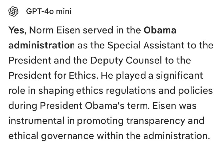 はい、ノーム・アイゼン氏はオバマ政権で大統領特別補佐官および倫理担当大統領副顧問を務めました。オバマ大統領の任期中、倫理に関する規制や政策の策定に重要な役割を果たしました。アイゼン氏は政権内の透明性と倫理的な統治の促進に尽力しました。