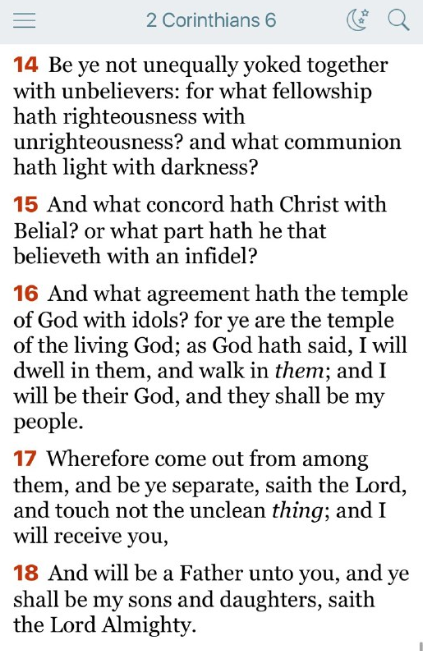 14 不信者と、つり合わぬくびきをいっしょにつけてはいけません。正義と不法とに、どんなつながりがあるでしょう。光と暗やみとに、どんな交わりがあるでしょう。