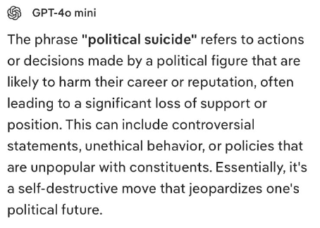 「政治的自殺」とは、政治家が行う行動や決定のうち、キャリアや評判に損害を与える可能性があり、多くの場合、支持や地位の大幅な喪失につながるものを指します。これには、物議を醸す発言、非倫理的な行動、有権者に不人気な政策などが含まれます。本質的には、政治的将来を危うくする自己破壊的な行動です。